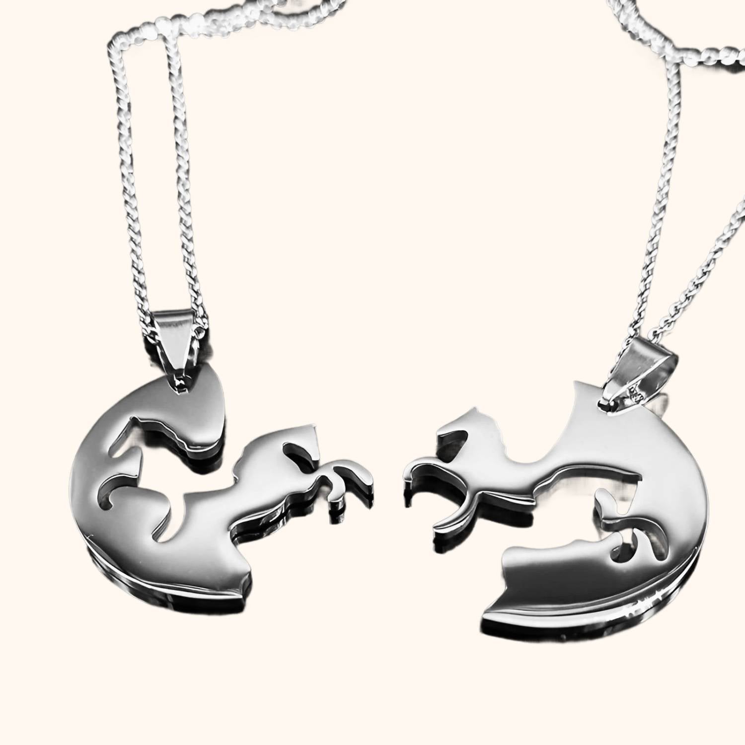 Un médaillon élégant, délicatement découpé à l’image de deux chevaux, offrant un symbole raffiné d'unité et de passion équestre