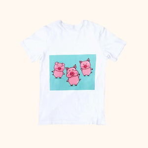 Adoptez ces trois petits cochons et ajouter un brin d'originalité dans votre quotidien. Un t-shirt au tendre design sur fond bleu avec 3 cochons trop mignons 🐷