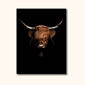 • Tableau noir avec une vache highland de face