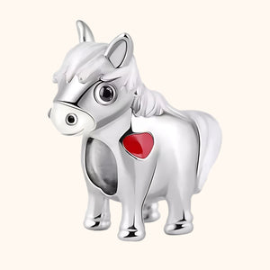 Un charm en forme de cheval argenté avec une crinière élégante et un cœur rouge éclatant