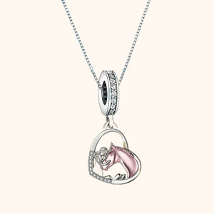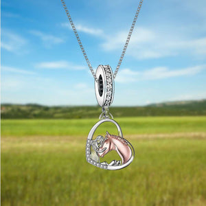 Un pendentif en argent avec un cheval rose enchâssé dans un cœur décoré de scintillant cristaux, suspendu à une chaîne délicate.