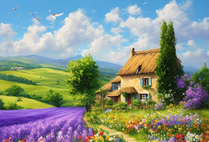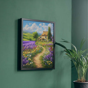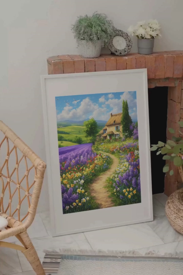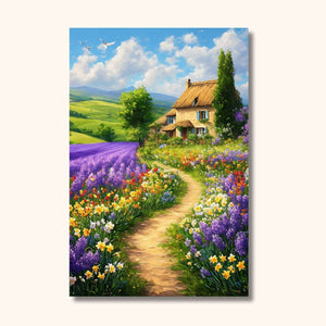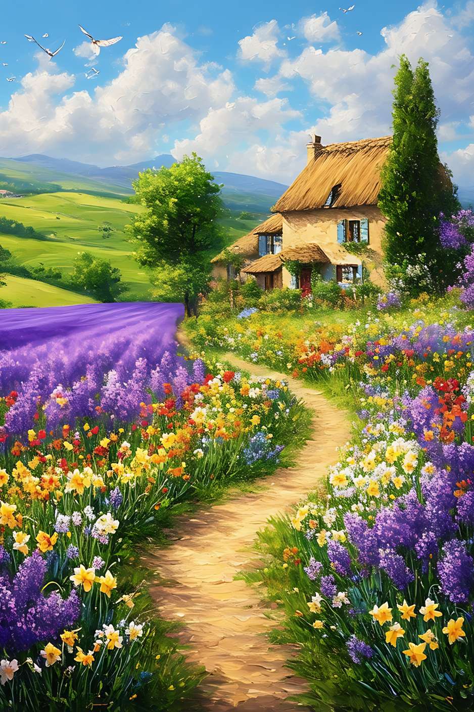 Une petite chaumière nichée au milieu des fleurs éclatantes, avec un chemin doré qui serpente vers un horizon paisible, c’est le rêve d’un fermier après une longue journée