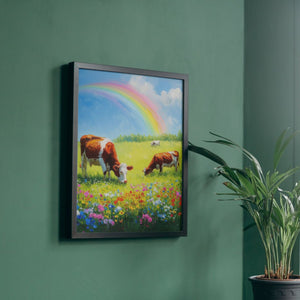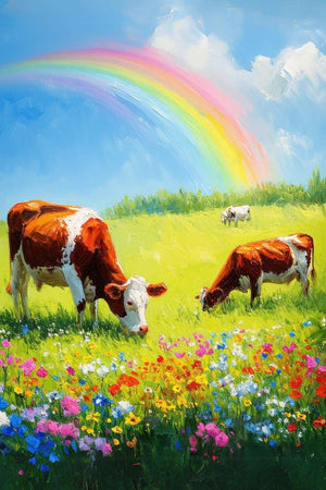 - Deux vaches paissent tranquillement dans un pré luxuriant, entourées de fleurs multicolores sous un arc-en-ciel éclatant