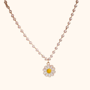 - Une petite marguerite blanche ou jaune accrochée à un collier de perles