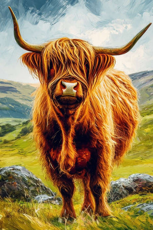 - Une vache Highland majestueuse, avec sa fourrure flamboyante et ses longues cornes, posée fièrement sur un fond de paysage vallonné et brossé
