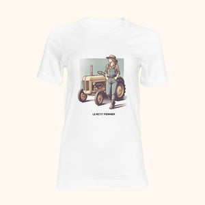 T-shirt fermier arborant une illustration nostalgique d'une agricultrice et de son tracteur, parfait pour un style champêtre chic