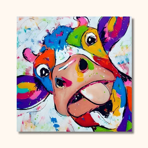 Une vache vibrante et colorée, peinte dans un style abstrait, semble joyeusement prendre vie sur la toile avec ses teintes éclatantes et son expression exubérante